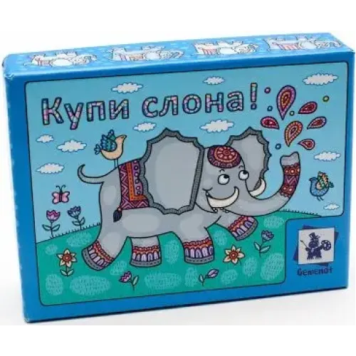 Студия Геменот презентовала свою новую настольную карточную небольшую и быструю игру, которая называется Купи слона и рассчитана на компанию игроков в возрасте старше восьми лет и в количестве от трех до шести человек. В основу этой игры положена известная народная карточная забава – Верю-не верю, в которую играли при помощи обычных игральных карт. Купи слона отличается от своей предшественницы тем, что в ее комплектации есть несколько спецкарт. Коробочка, в которой находится игра - маленькая, компактная, изготовлена из качественного плотного картона, карты с яркими, четко прорисованными изображениями животных.