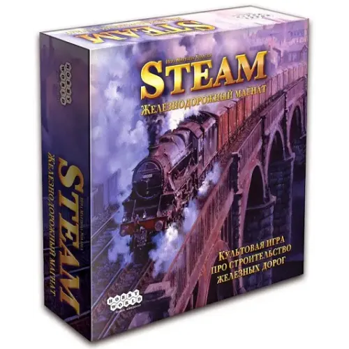 Паровой двигатель, созданный человеком, очень сильно изменил его жизнь. С настольной интересной серьезной экономической стратегией Steam. Железнодорожный магнат от Мира Хобби игроки (а их может быть от трех до пяти человек старше 12 лет) займутся строительством и развитием транспортных магистралей, созданием наилучших локомотивов, перевозкой огромного количества товаров, строительством и благоустройством городов. Большое количество различных опций, поле для игры двустороннее и впечатляющего размера, а большой бизнес наполнен интригами и хитрыми планами.