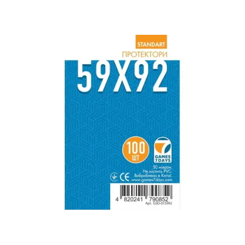 Заказать игру Протекторы для карт Games7Days (59 х 92 мм, Euro, 100 шт.) (STANDART) в Киеве можно по телефонам: (044) 361 51 65; + 38 (096) 285 56 40; + 38 (095) 919 18 13; +38 (063) 648 52 58; mail@cbgames.ua
