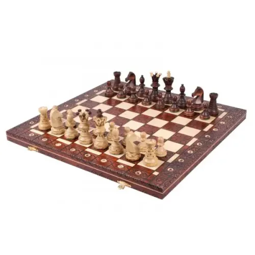 Это шахматный набор из серии Royal - есть еще несколько наборов меньших размеров. Роял 54 см очень похож на набор Амбассадор. Фигуры точно так же сделаны из граба и платана. Однако на доске есть дополнительные выжигания на темных клетках. Внутри шахматная доска имеет ниши для хранения шахматных фигур. Royal 54 часто покупают на подарок