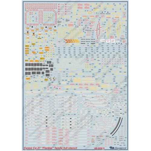 Полный набор технических надписей на один самолет типа Су-27 (ранних или поздних производственных серий) или Су-27УБ (ранних или поздних производственных серий) или Су-33 и подвесное вооружение на любой самолет семейства Су-27 (40 типов ракет "Воздух-Воздух", "Воздух-Поверхность", НАР, блоки НУРС, контейнеры наведения и дозаправки, свободнопадающие и корректируемы авиабомбы. Комплект содержит три листа деколи большого размера и инструкицию на 4-х листах формата А3.