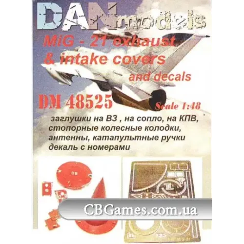 Фототравление МиГ-21:заглушки на ВЗ, на сопло, на КПВ, колодки колесные, антенны, катапультные ручки и декаль с № (DAN48525) Масштаб: 1:48