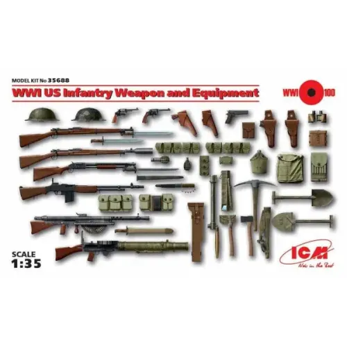 Набор включает модели оружияи снаяжения пехоты США - ручные пулеметы, винтовки и винтовочные мортирки, подсумки, гладкоствольные ружья Винчестер обр.1897г., револьверы Кольт и Сит-Вессон, пистолеты Кольт, кобуры, штыки-ножи к винтовкам и ножны, траншейные ножи, ручные гранаты, шлемы, противогазные сумки, траншейные перископы, бинокли и футляры, офицерские сумки, малые лопаты, топоры, киркомотыги, фляги.