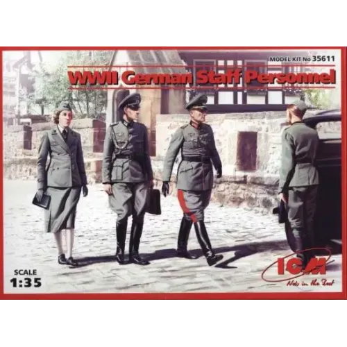 Набор сборных пластиковых фигурок немецкого штабного персонала ICM 35611. Детали отлиты из качественного пластика, набор содержит 4 фигуры: генерал, офицер, служащая вспомогательной службы связи, а также водитель. Данный набор превосходно подходит для использования в диорамах с немецкими легковыми автомобилями времен Второй мировой войны.