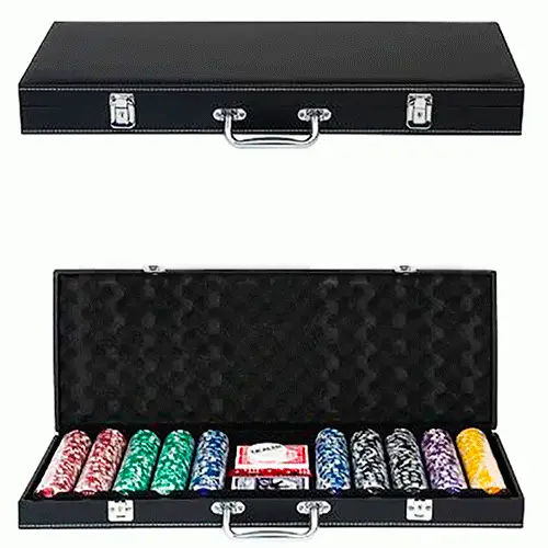 Покерный набор на 500 фишек с номиналом в кожаном кейсе для удобной транспортировки и хранения. В наборе также имеются две колоды карт, фишка дилера и игральные кости.