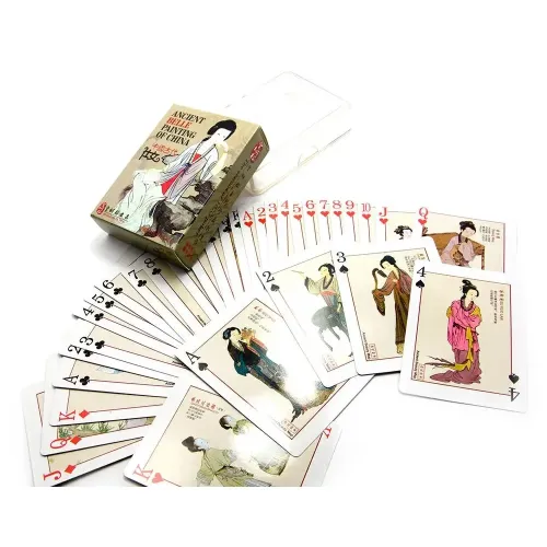 Игральные карты "Древние картины китайской живописи и фарфора" изготовлены из картона со специальным покрытием, улучшающим скольжение, они подойдут для любительской игры. Рубашка представляет собой старинную китайскую картину с бытовым сюжетом — сценкой повседневной жизни. 54 карты в этой колоде — это 54 традиционные китайские картины, изображающие прекрасных китаянок в национальных костюмах, так называемые карты красоты. Они смогут принести эстетическое наслаждение ценителям изящества и красоты. Карты упакованы в пластиковую коробку.