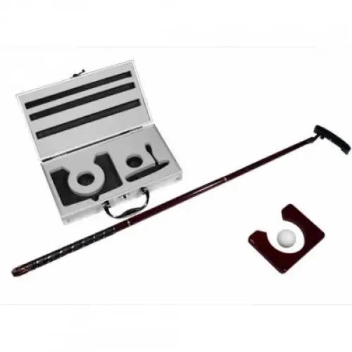 Набор для гольфа AG-2039С-2 в металлическом кейсе. Кейс закрывается с помощью замка (см. фото ниже). Сборная клюшка состоит из 4 сборных частей: деревянной ручки и головки клюшки. Полированные детали ручки , покрыты лаком. Лунка деревяная.