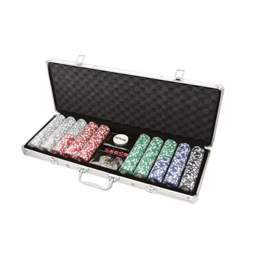 Набор из 500 покерных фишек с номиналом в удобном и надежном серебристом кейсе, подходящем как для хранения, так и для транспортировки.