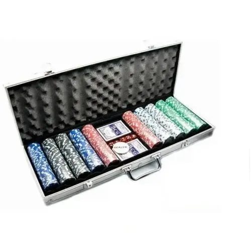 Покерный набор на 500 фишек без номинала в серебристом кейсе для удобной транспортировки и хранения. В наборе также имеются две колоды карт, кнопка дилера и игральные кости.