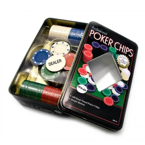 Наиболее доступный вариант из комплектов для покера - Покерные фишки. Набор содержит пластиковые фишки без номинала, которых достаточно для комфортной игры двух человек, а также кнопку дилера. Набор поставляется в удобной для хранения цветной жестяной коробке.