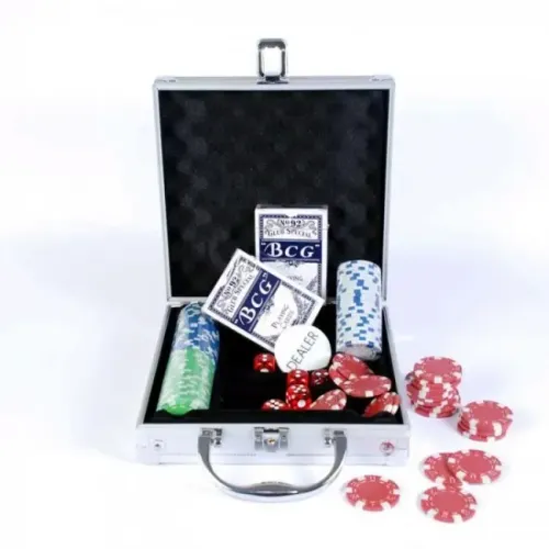 Покерный набор на 100 фишек без номинала в серебристом кейсе для удобной транспортировки и хранения. В наборе также имеются две колоды карт, кнопка дилера и игральные кости.
