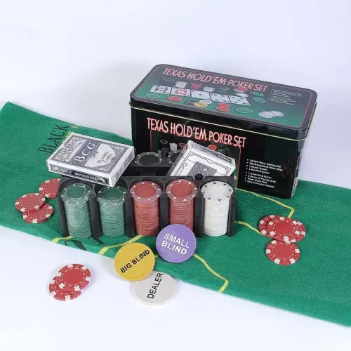 Один из недорогих комплектов для покера на четырех игроков - покерный набор на 200 фишек "Техасский холдем". Набор содержит 4-х граммовые пластиковые фишки пяти цветов с номиналом, а также две колоды покерных карт, фишки дилера и блайндов. Кроме того, в наборе имеется зеленое синтетическое сукно, размеченное под Блэк Джэк. Набор поставляется в удобной для хранения цветной жестяной коробке.