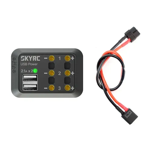 Компактный и удобный разветвитель для подключения трёх зарядных устройств SkyRC или других потребителей к одному блоку питания. В комплекте прилагается шнур с наконечником "XT60" для удобного подключения к блоку питания или мобильной батарее. Также разветвитель оснащён двумя портами USB для подключения смартфонов, планшетов и USB-ламп.