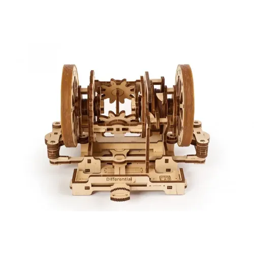 Собрав Дифференциал, Вы можете разблокировать его, зафиксировав рычаг блокировки в положении Вверх (UP). Поворачивая приводную шестерню или колесо, приводим в движение оба колеса. Перемещая рычаг нагрузки вправо и влево, можно плавно регулировать блокировку колес (левого или правого, независимо друг от друга). Если опустить рычаг блокировки вниз (положение Вниз "Down"), оба колеса жестко сцеплены между собой. Они вращаются вместе (от приводной шестерни или от колеса) или блокируются одновременно (рычагом или колесом).
