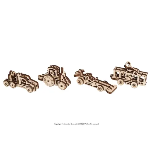 Уникальный набор из 4-х отдельных миниатюрных моделей для самостоятельной сборки для взрослых и детей от 5 до 80 лет и более. В набор входят Спортивная машина, Трактор, Грузовик, Трамвайчик, кожаная модель содержит базовые элементы механики.