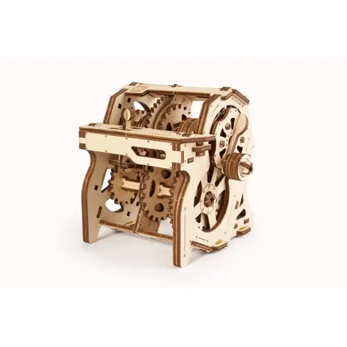 Механічна коробка передач – це стилізована навчальна модель, інтерактивний навчальний посібник, призначений для вивчення принципів роботи його механізмів. Механічна коробка передач – це редуктор, який здійснює передачу оборотів із двигуна на ведучі колеса. Після складання моделі проведіть експеримент: виберіть по черзі кінетичні пари шестерень, увімкнувши важелем по черзі I, II, III і реверсну передачу та керуйте швидкістю обертання ведучого та веденого валів.
