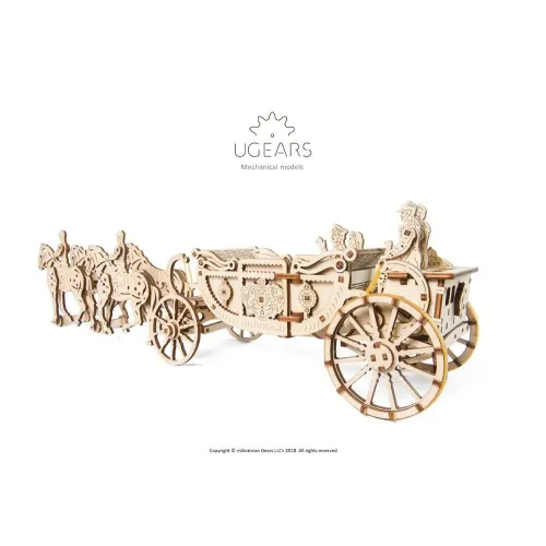 Работая над моделью, дизайнеры Ugears уделили особое внимание деталям: салон кареты имитирует мягкую обивку, кучеры одеты в официальную форму, а четвёрка грациозных лошадей красуется в парадной сбруе. Двери экипажа, украшенные гербом, фиксируются в открытом и закрытом положении. Резинки выполняют роль ремня декоративной подвески, что добавляет конструкции реалистичности.
