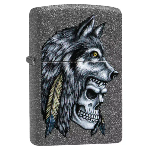 Зажигалка Zippo Wolf Skull Feather Design 29863 - это зажигалка из латуни с поверхностью Iron Stone серого цвета. На лицевой поверхности зажигалки выделен рисунок волка с черепом. Эта классическая ветрозащищенная модель сочетает в себе прочность и стиль, придавая аксессуару уникальный и яркий внешний вид