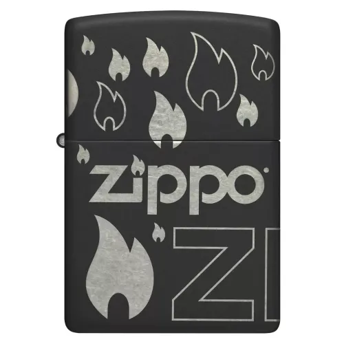 Эта элегантная модель в черном матовом цвете украшена классическим логотипом Zippo и значком пламени в четком и точном дизайне Laser 360°, что окружает изделие яркими хромированными тонами.