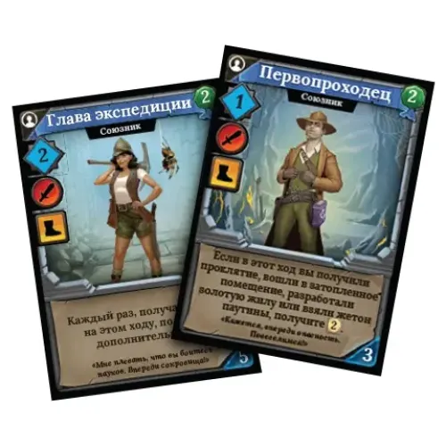 Промонабір для доповнення до настільної гри Кланк: Золото і Шовк включає 2 унікальні карти: Першопрохідник і Глава Експедиції.