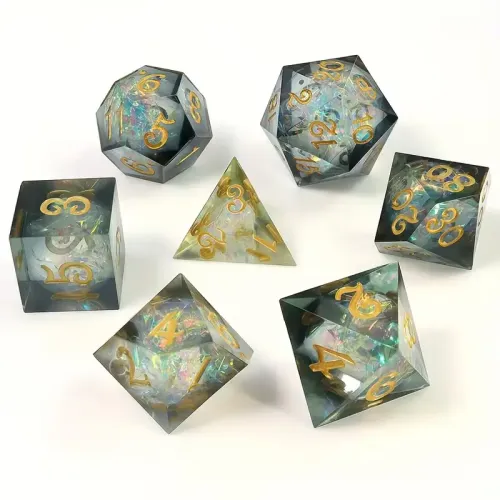 Це напівпрозорий набір кубиків для RPG, що переливається, виготовлений зі смоли, з неймовірними неповторними візерунками і вкрапленнями.