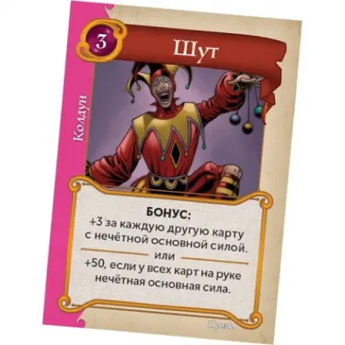 Промокарта Блазня для гри " Чарівні королівства " дозволить урізноманітнити геймплей ще більшою кількістю комбінацій із колодою. Блазень дає +3 за кожну карту з непарною силою або +50, якщо всі карти в руці мають непарну силу.