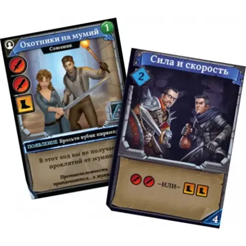 Промонабір для додатку до настільної гри Кланк. Прокляття Мумії включає 2 унікальні карти: Мисливці на мумій і Сила і Швидкість.