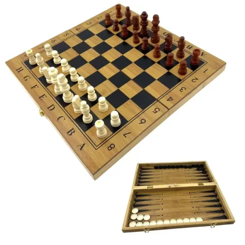 Дошка виконана з бамбука з подвійною функцією: з одного боку можна грати в шахи та шашки, а з іншого – в нарди. Вона легко складається і служить одночасно коробкою для зберігання всіх фігур і фішок, що зручно для транспортування та збереження.