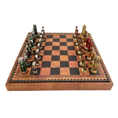 Набір шахи+нарди+шашки ITALFAMA "Римляни проти варварів" ITALFAMA, фігури метал, розфарбовані вручну, фішки пластик, дошка обтягнута шкірою, карта, коричневі, 36X36, вага 5 кг, Італія (199321MAP)