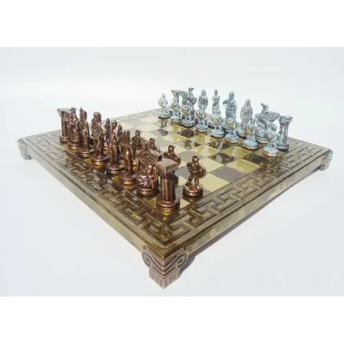 Історичні шахи Manopoulos Спартанські воїни передають колорит того давнього часу (480 рік до н. е.), коли загони спартанських піших воїнів — гоплітів перекрили вузький Фермопільський прохід численної перської армії царя Ксеркса. Два дні їм вдавалося відбивати переважаючі сили персів, але зрада одного з місцевих жителів, який провів ворожі загони в обхід захисників, не давало жодного шансу на перемогу. Все грецьке військо відступило, окрім трьохсот спартанців та ще двох загонів — фіванців та фесапійців, які, втім, невдовзі теж здалися на милість ворогові. Спартанці знали, що їм не виграти бій, але відступити не дозволяли закон та честь. Коли перський цар Ксеркс зажадав від спартанців, щоб вони здали зброю та щити, йому відповіли: «Прийди та візьми». "Наші стріли і дротики закриють від вас сонце", - стали загрожувати перси. «Тоді ми боротимемося в тіні», — відповіли спартанці. Мужні воїни не відступили та загинули, прийнявши нерівний бій. У Стародавній Спарті головною силою армії виступали гопліти — важкоозброєні піші воїни. Їхнє озброєння складалося з важкого щита, меча та довгого списа. Воїни носили на голові шоломи іллірійські, або кеглі. Їх робили з бронзи і прикрашали гребенем із кінського волосся.