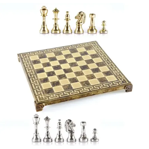 Шаховий набір Manopoulos Classic Metal Staunton із золотими/срібними шаховими фігурами та бронзовою шахівницею коричневого кольору з візерунком по периметру 36x36 см.