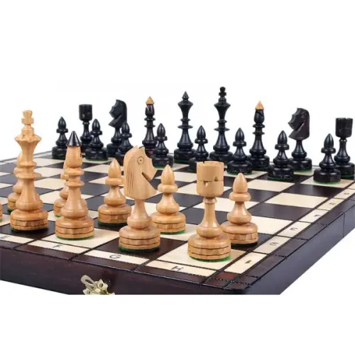 Цей Індійський набір польського виробництва користується популярністю завдяки своєму оптимальному розміру та оригінальному дизайну. Фігури виготовлені з граба. Шахова дошка прикрашена випалюванням і має ніші для зберігання шахових фігур усередині.