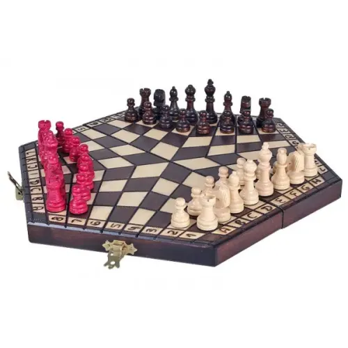 Незвичайні для багатьох шахи для трьох гравців. Грати не надто зручно через невеликий розмір цього набору. Проте ці компактні шахи не займають багато місця і їх завжди можна взяти з собою. Фігури зроблені з граба та бука. Листівка з правилами гри вкладена у кожен набір. Усередині дошка має три відділення для зберігання шахових фігур.