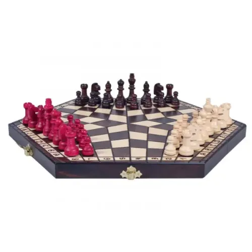 Незвичайні для багатьох шахи для трьох гравців. Грати зручно завдяки оптимальному розміру цього набору. Фігури зроблені з граба та бука. Листівка з правилами гри вкладена у кожен набір. Усередині дошка має три відділення для зберігання шахових фігур.