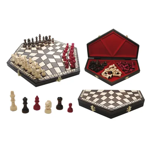 Шахи на трьох, звучить загадково, але грати в цю гру досить цікаво. Потрібно зазначити, що дошка та шахові фігури зроблені з дерева польськими майстрами та відповідають європейським стандартам. З цим комплектом можна добре провести час у компанії, також шахи на трьох стануть чудовим подарунком.