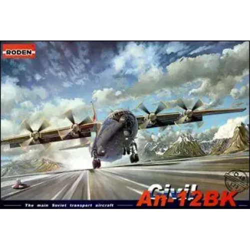 Розмах крила: 52,7 см Характеристики моделі пасажирського літака Антонов Ан-12БК "Куб": У наборі, деталі для склеювання пластикової моделі пасажирського літака Антонов Ан-12БК "Куб". Коробка, як зазвичай у стилі Roden, яскрава і барвиста, з малюнком. У комплект набору для складання моделі пасажирського літака Антонов Ан-12БК "Куб":