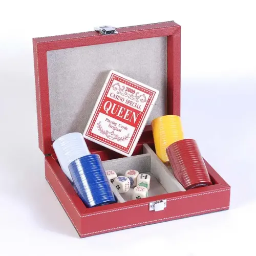 Покерний набір на 80 фішок без номіналу в чудовому червоному шкіряному кейсі. Набір містить колоду покерних карт, 80 фішок без номіналу, а також гральні кубики з картковим маркуванням граней для гри в "покер на кістках".