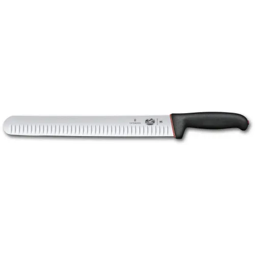 Ніж для нарізання Victorinox Dual Grip з рифленим лезом 30 см та двокомпонентним руків’ям. Спеціалізований слайсерний ніж з лінійки Dual Grip, щою нарізати на акуратні скибочки м'ясо, жирні сорти риби або сир. Спеціальні заглиблення на бічній частині леза працюють як своєрідний повітряний буфер і прискорюють процес нарізання без зайвих зусиль і без прилипання до робочої поверхні. Професійний інструмент для використання в домашніх та промислових масштабах.
