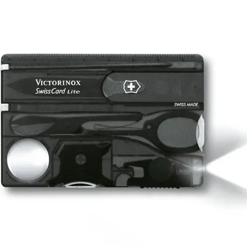 SWISS CARD LITE (чорний) від Victorinox – швейцарський мультинабір у легкому та компактному форматі кредитної картки на 13 функцій, серед яких вбудований LED-ліхтарик та фірмовий інструмент Quattro. Популярна Швейцарська картка легко поміщається навіть у гаманці чи будь-якій кишені.