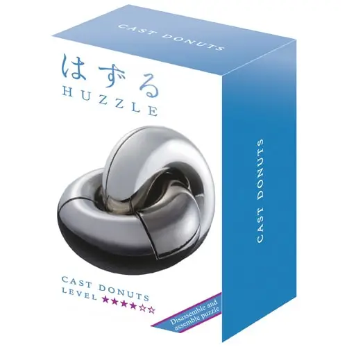 Лита головоломка Huzzle Donuts має елегантну форму. 2 гладких кільця, які виглядають як 2 пончики, що переплітаються одне з одним. Кожне кільце теж складається з 2 частин, але... Пончики крутяться, а більше начебто нічого не рухається! Як же їх розібрати?