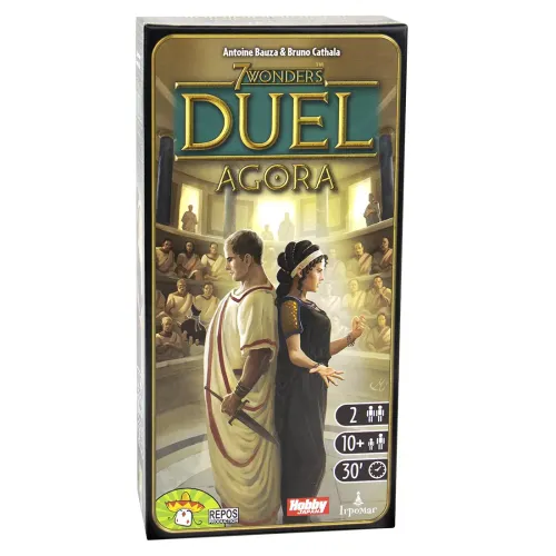 У доповненні 7 Чудес: Дуель. Агора (7 Wonders Duel: Agora) вас чекає нове поле Сенату, карти сенаторів, будівель і змов, а також інші компоненти, які додадуть глибини і варіативності до гри. Карти сенаторів поділені за епохами й додаються до основних колод, тоді як карти змов утворюють окрему колоду.