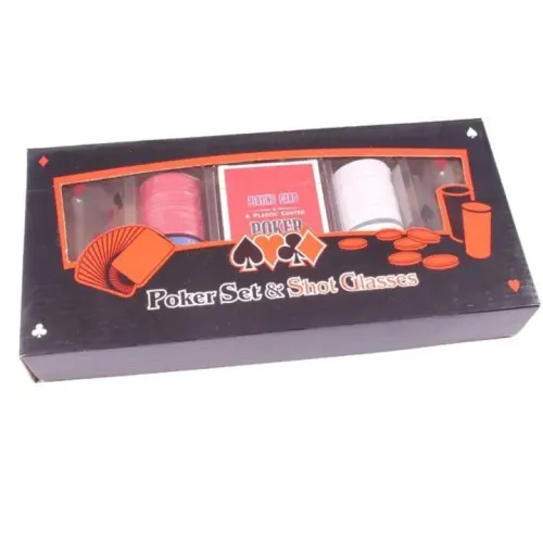 Набір П'яний покер Duke допоможе весело провести вільний час. Гра розрахована на двох гравців. До складу набору входять: колода гральних атласних карт покеру (54 листи), 100 двограмових фішок без номіналу, 2 чарки по 60 мл. Набір упакований у картонну коробку розміром 28*12*5 см.