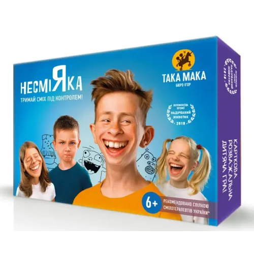 Версія 6+ орієнтована в основному на дітей, але це не означає, що дорослі не можуть долучитися до гри. Навпаки, грати разом з дітьми може бути ще складніше! Несмійка — ідеальний вибір для веселих вечірок, коли не хочеться заглиблюватися в складні правила або серйозні ігри. Це також чудовий подарунок для друга, колеги чи дитини!