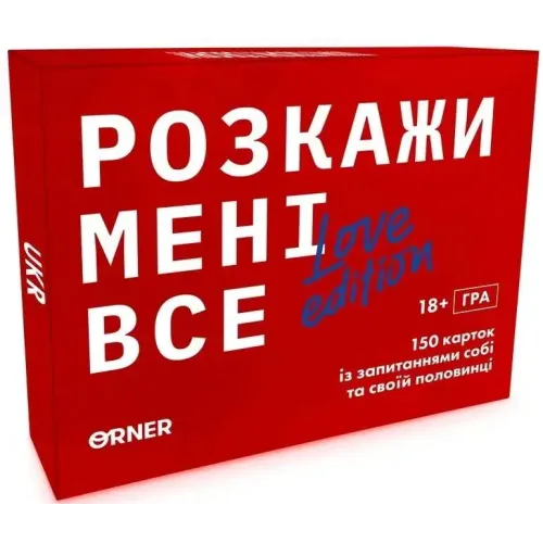 Ця розмовна гра належить до категорії 18+, адже містить також питання інтимного характеру. Гра розрахована на двох учасників і включає 150 карток із різноманітними запитаннями. Вони охоплюють теми, які допоможуть краще пізнати партнера, поділитися думками й обговорити хвилюючі аспекти стосунків. Деякі питання інтригуватимуть, інші викличуть сміх чи роздуми, але всі вони спрямовані на зміцнення зв’язку між вами.