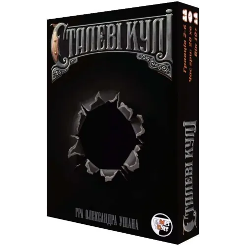 Настільна гра Сталеві кулі – це динамічний картковий філер для компанії від двох до шести осіб, в якому удача відіграє ключову роль. Гравці збирають колоду карт, яка імітує роботу револьвера, а основна мета полягає в тому, щоб залишитися єдиним, хто вижив. Учасники по черзі роблять хід, намагаючись уникнути картки Бабах за допомогою карток ситуацій. Якщо гравець витягує зловісну картку Бабах і не може уникнути її наслідків, він вибуває з гри, передаючи хід наступному. Після закінчення патронів револьвер перезаряджається.