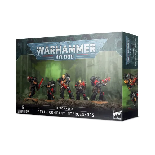 Даний набір містить компоненти для складання п'яти Заступників Кривавих Ангелів із Роти Смерті (Blood Angels Death Company Intercessors). В якості зброї вони можуть використовувати три види болтерів: звичайну модель із серповидним магазином, варіант із зарядником і коробчатим магазином, а також болтер типу "Ловчий", що відрізняється прицілом для далеких дистанцій. Також у цій коробці ви знайдете набір покращення Кривавих Ангелів Прімаріс, необхідний для того, щоб додати вашим мініатюрам унікальну геральдику та символіку синів Сангвінію.