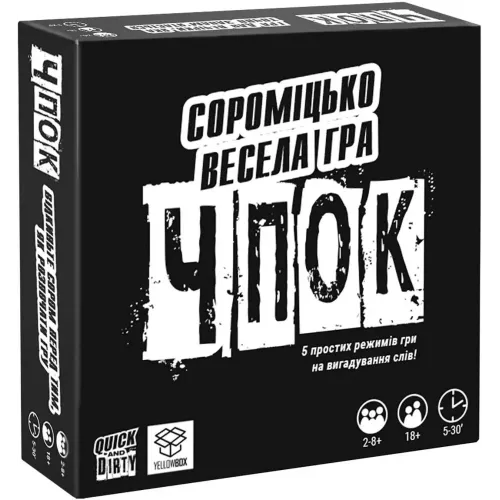 Купить настольную игру Чпок (Quick And Dirty) UA в Киеве можно в магазине настольных игр и моделирования CBGames. Доставка товара Чпок (Quick And Dirty) UA осуществляется курьером в Киеве (есть самовывоз) и компаниями грузоперевозчиками по Украине и другим странам мира.