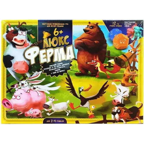 Ферма Люкс - это украинская версия популярной игры Суперфермер, которая по качеству ничем не уступает оригиналу. Игровые компоненты, в частности фишки животных и 12-гранные кубики, изготовленные из прочного пластика, а игровое поле и карточки созданы из плотного картона. Игра отличается хорошей полиграфией, яркими цветами и правилами, доступными на двух языках.
