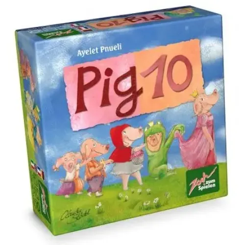 Победителем 10 свинок (Pig 10) - настольной карточной игры, будет тот игрок, который умеет лучше, чем другие участники считать до десяти и у которого в конце игры будет больше всех карт. И как же к этому прийти? Ничего сложного. Игроки (естественно по очереди) кладут на стол карты с изображением поросят и написанными цифрами. Цифры, указанные на карточках надо сложить. И к получившейся сумме игроки должны добавить карту с такой цифрой, чтобы общая сумма получилась равной десяти. Тот участник, который это сделает, забирает все карты себе, и играем дальше. Казалось бы, что здесь сложного. А сложность вот в чем: если общая сумма (после того как игрок добавил свою карту) будет больше десяти, хотя бы на единичку, то карты достаются сопернику и мы своими действиями приближаем его к победе. Кроме того, есть свинки, которые могут подложить участникам игры самую настоящую свинью. Например, свинка-лягушка может превратить все цифры в ноль, а свинка-русалка может увеличить или уменьшить сумму на пять очков. Вот и думай, что все просто!