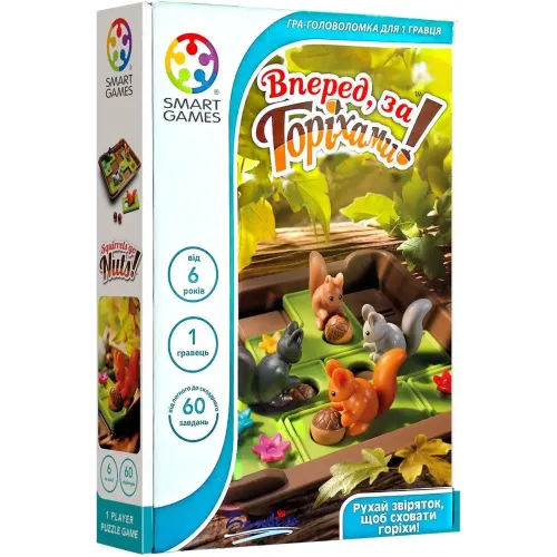 Вперед, за орехами! (Squirrels Go Nuts!) предлагает игрокам увлекательную задачу помочь Белке спрятать свои желуди, планируя свои ходы стратегически на игровой доске. Игра содержит 60 задач, требующих развития когнитивных навыков, таких как планирование и логическое мышление. Благодаря портативной игровой панели с крышкой этот набор идеально подходит для путешествий.